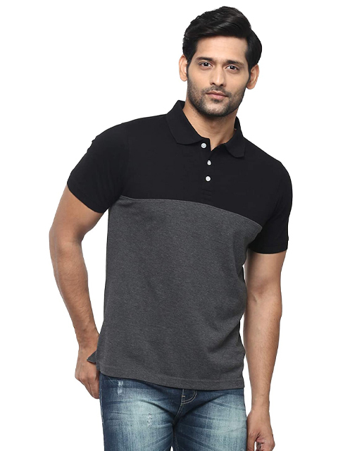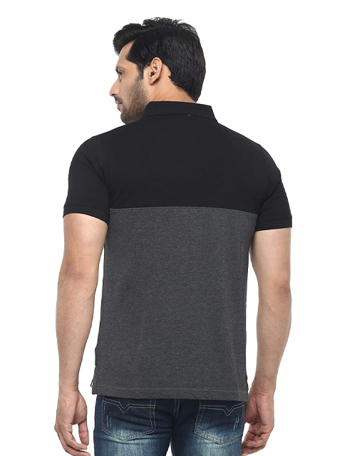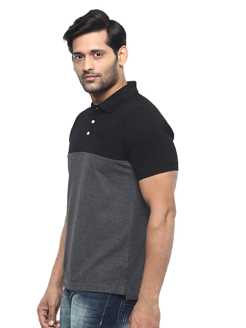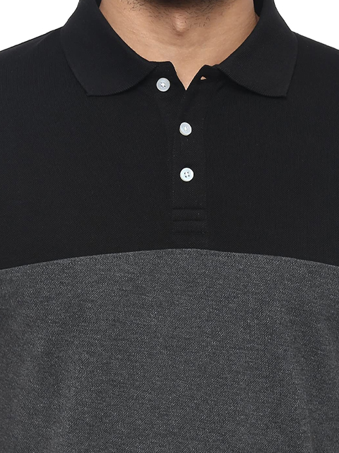 A black and grey solid T-shirt with a polo collar and short sleeves.