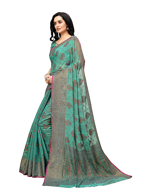 Sea green banarasi saree with woven design. The model is wearing a blouse from our stylist's collection. See the image for a mock-up. An unstitched blouse comes with the saree.