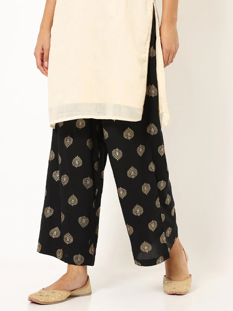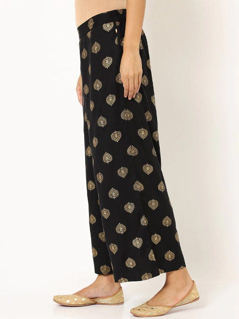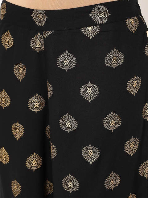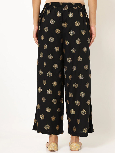 A pair of Black and Gold-toned printed woven flared fit Palazzos, opaque, 2 pockets, and slip-on closure