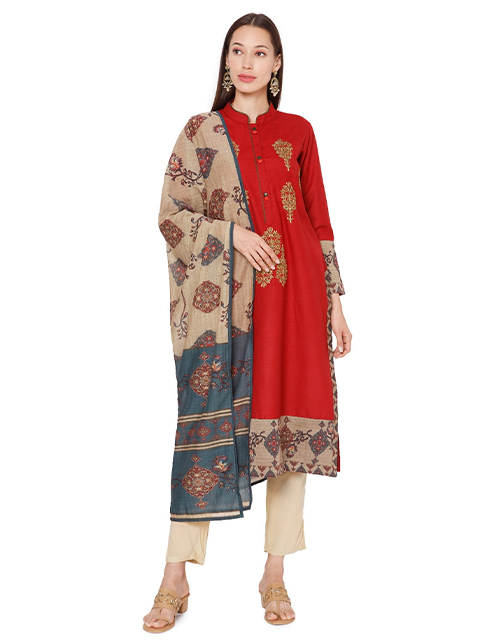 Women's Floral With Embroidery Straight Kurta Trouser with Dupatta