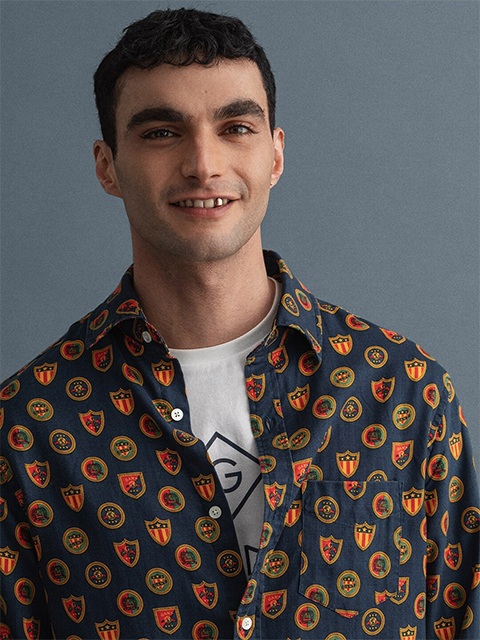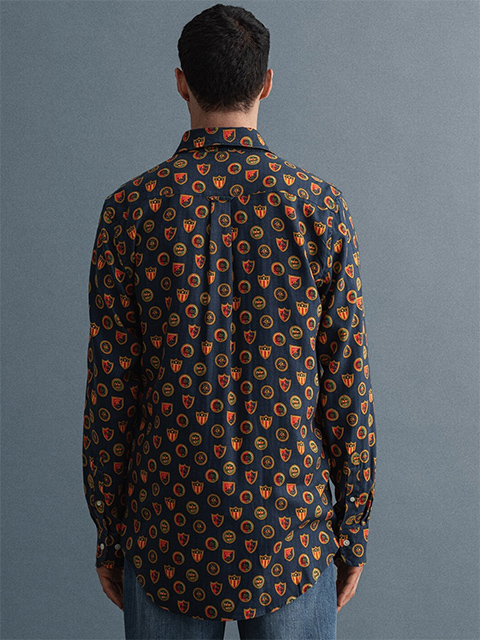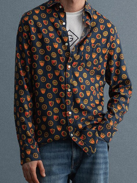 Blue graphic printed opaque Casual shirt , has a mandarin collar, button placket, 1 patch pocket, long regular sleeves, curved hem.