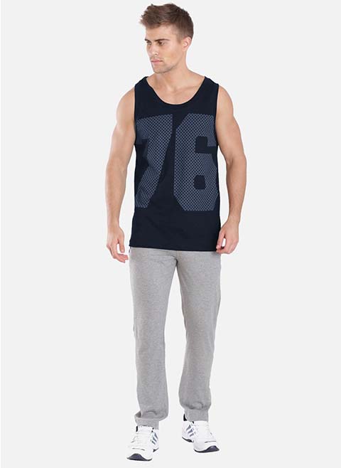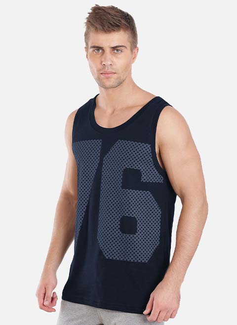 Navy Blue and grey printed knitted gym vest, has a round neck, and sleeveless