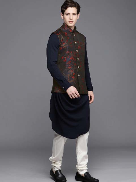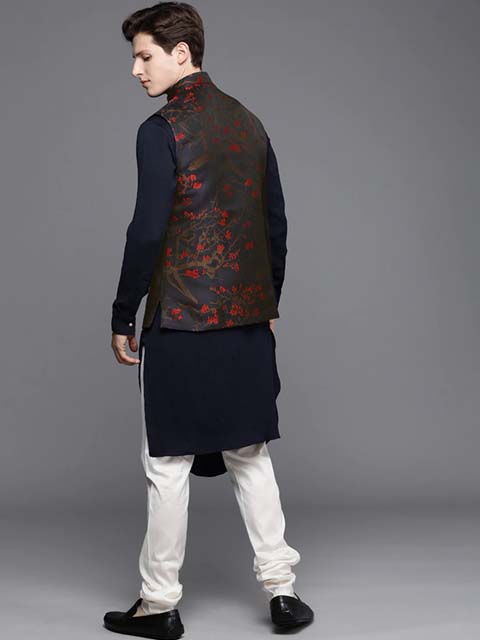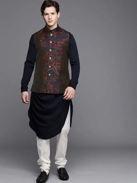 Men Navy Blue & White Self Design Pleated Kurta with Churidar & Nehru acket
