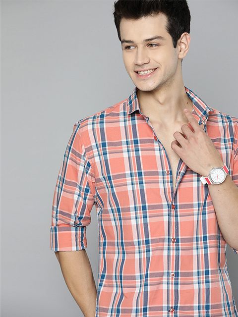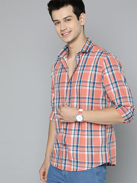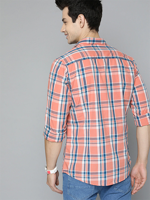 Men Peach-Coloured Tartan Checks Casual Shirt