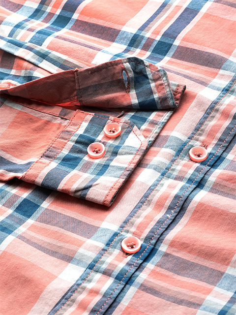 Peach-colored tartan checks opaque Casual shirt, has a spread collar, button placket, regular long sleeves, curved hem
