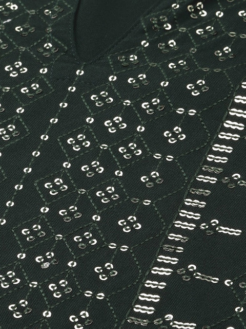 Wear this green Mandarin Collar embroidery kurta to look your ethnic best. Designed with the finest Viscose Rayon fabrics, this apparel provides utmost comfort. Add statement jeweler and jetties to complete your look.