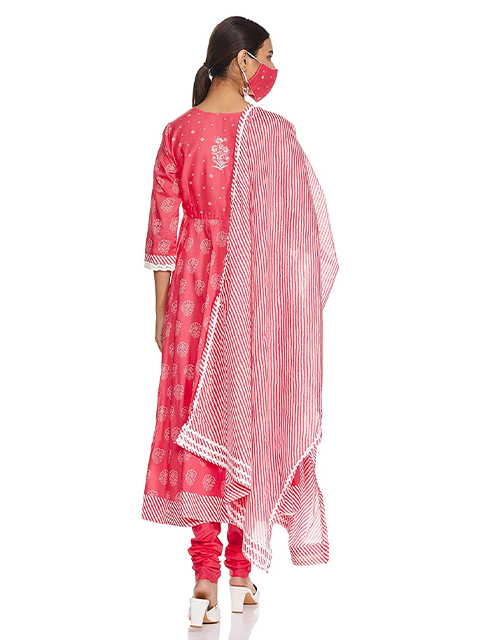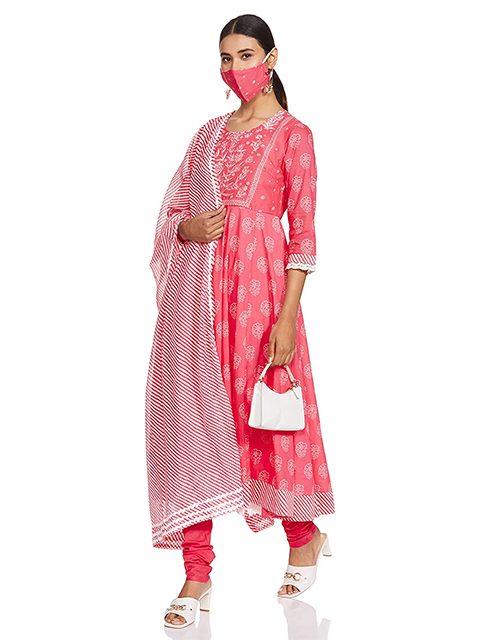 You will love this Anarkali Sets if pink is your favorite colour. The  quarter sleeves and border are embroidered and laced in magenta. A waistband with drawstrings and tassels gives the waist a perfect shape