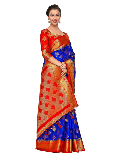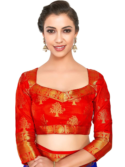 The blouse worn by the model might be for modelling purpose only. Check the image of the blouse piece to understand how the actual blouse piece looks like.