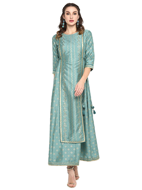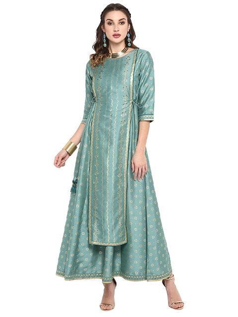 You can pull off that runway look you've been wanting to try. This paneled dress features round neckline with print in center panel, 3/4th sleeve, A-line silhouette, and an adorable paisley print in gold color. Wow any festival or family function by pairing this green piece with platform heels and gold jewellery.