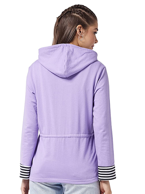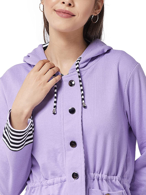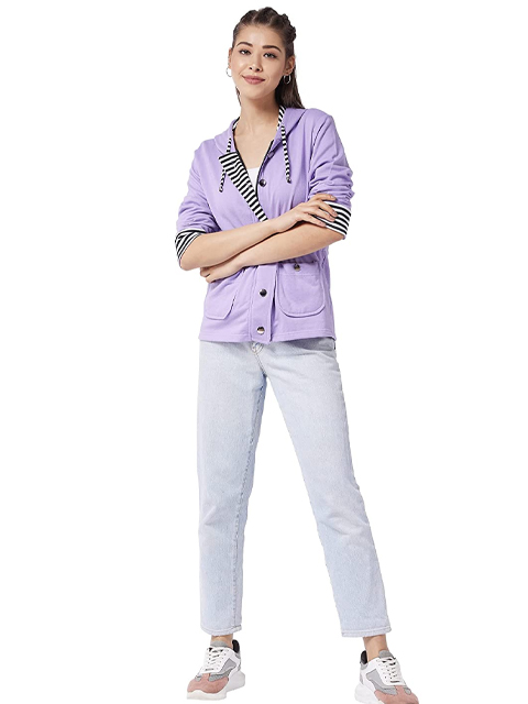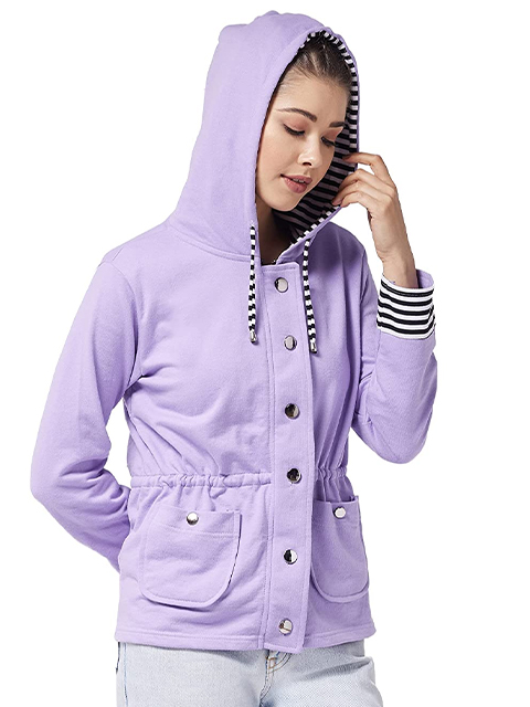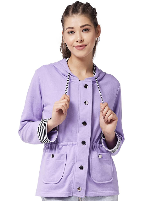 Lavender Cotton Solid Hooded Jacket Has A Round Neck, Full Sleeves, Two Front Pockets, And A Zipper