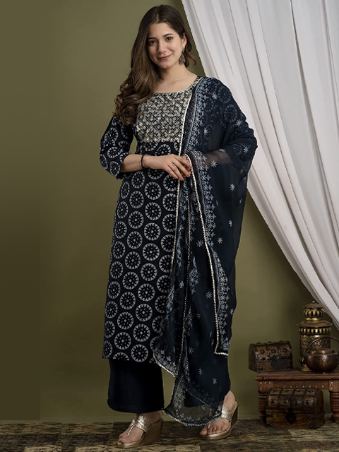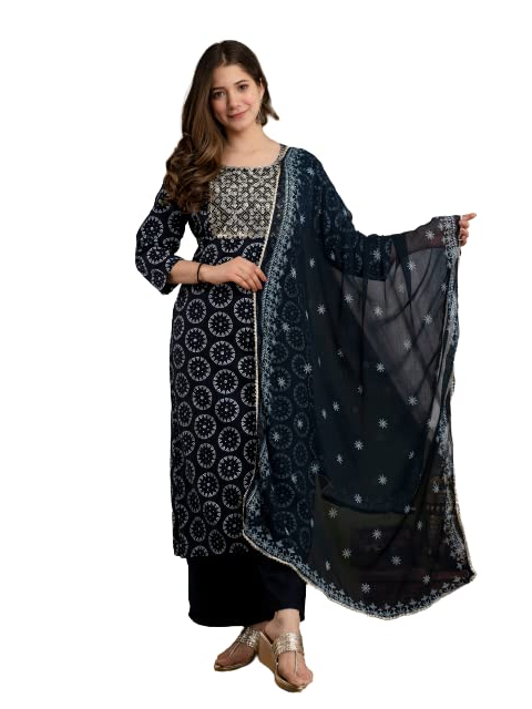 Women's Rayon Printed & Embroidery Work Straight Kurta with Palazzo & Dupatta Set