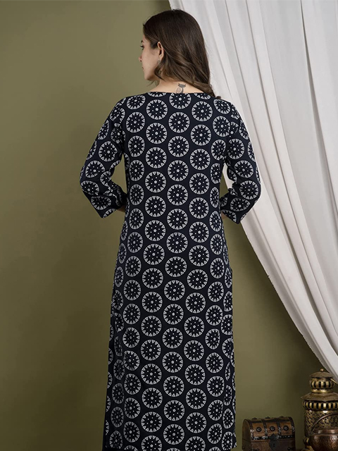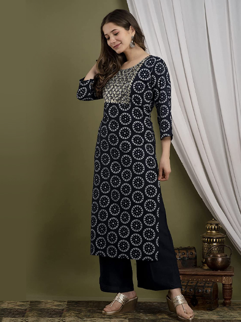 Rekindle your inner style quotient by wearing this blue kurta and pant set with a dupatta. Tailored to sartorial perfection from premium quality fabric, it assures a soft and soothing touch against the skin. The round neck adds to its appeal. The three-quarter sleeves further speak for themselves.
