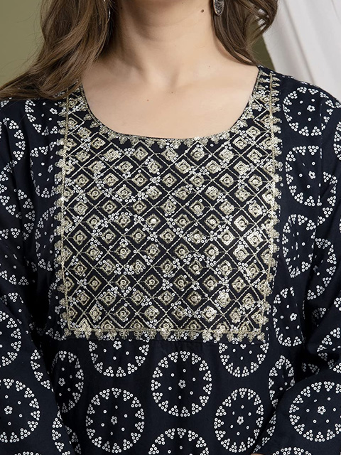 Women Navy Blue Ethnic Motifs Embroidered Thread Work Kurta with Trousers & With Dupatta