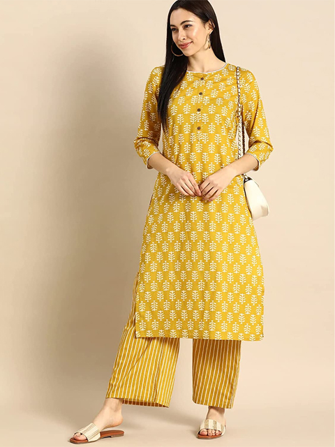 Women's Yellow Colour Cotton Printed Kurta with Palazzo Set